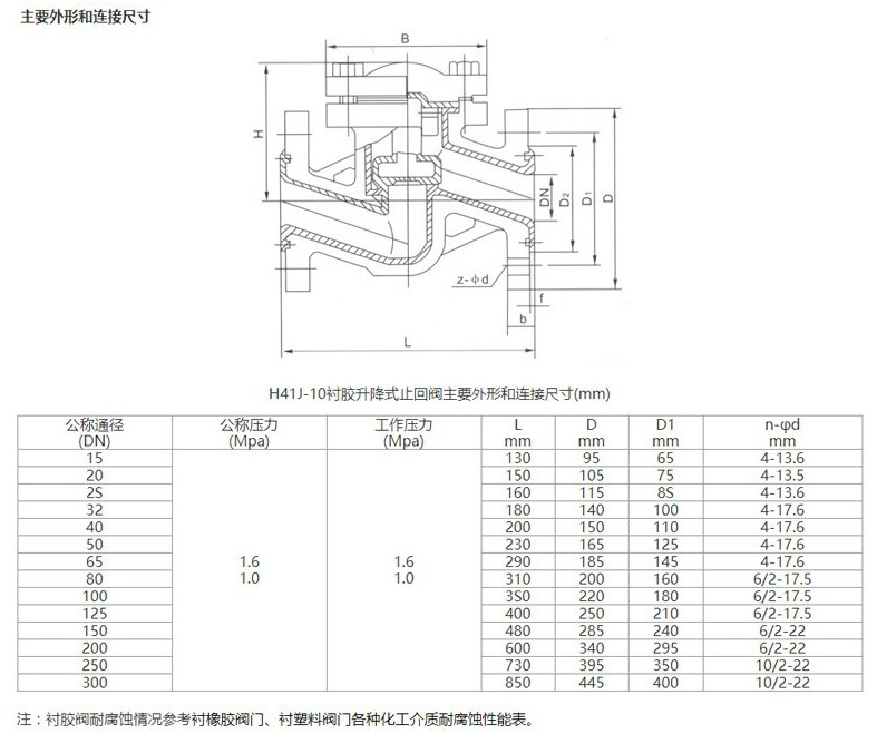 H41J-10 升降式襯膠止回閥產(chǎn)品槪述:H41J村膠升降式止回閥專用于控制非腐蝕性或一般腐獨性介質(zhì),閥體內(nèi)腔表面無村里或覆有可供選擇的各種像膠、適用于不同工作溫度和液體管路。H41J襯膠升降式止回閥屬于一種自動閥門,其主要作用是防止介質(zhì)倒流、泵及驅動電動機反轉,以及容器介質(zhì)的泄放,止回閥還可用于給其中的壓力可能升到超過系統(tǒng)壓的輔助系統(tǒng)提供補給的管路上,H41J村膠升降式止回閥的閥瓣呈圓盤狀,繞閥座通道的轉軸作升降式運動,升降式止回閥密封性能比旋啟式要優(yōu)越。